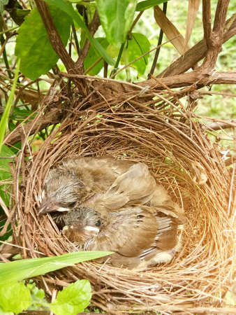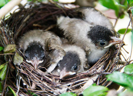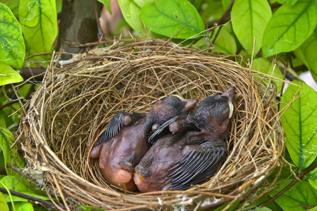 Baby birds in the nest on a background of green leaves. Shallow depth of field.