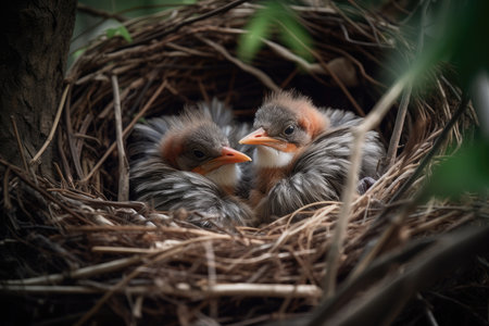 newborn birds sleeping in their nest, surrounded by twigs and feathers, created with generative ai