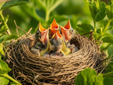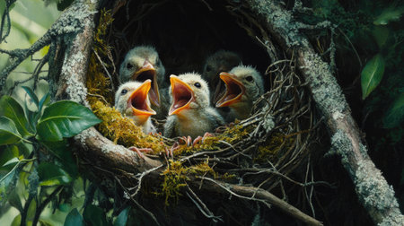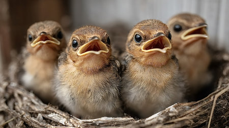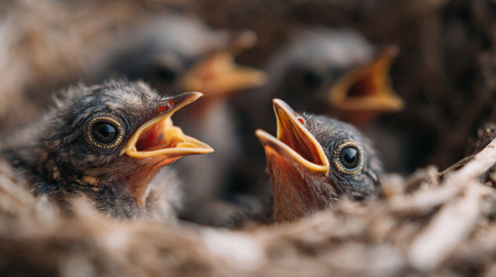 Four hungry baby birds, chirping and opening their beaks wide in their nest, eagerly waiting for their mother to return with food, embodying the essence of wildlife and nurturing care