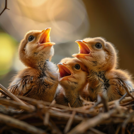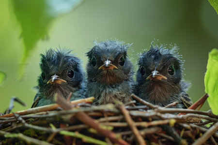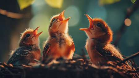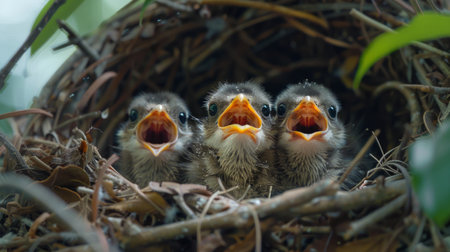 Three hungry baby birds with open beaks await food in their nest. This vibrant scene captures the essence of wildlife and the joys of nurturing in nature.