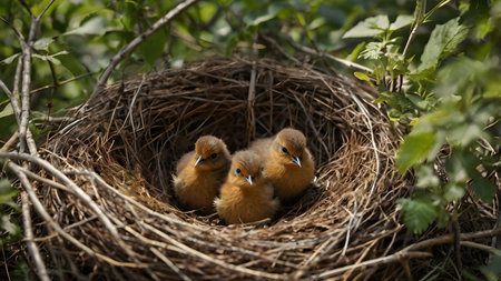Three adorable chicks nestled in a cozy nest, surrounded by soft feathers and natural beauty. A perfect capture of new life and nurturing.