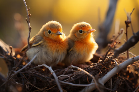 Two baby birds sitting in a nest, captured with a blurred background for a bokeh effect