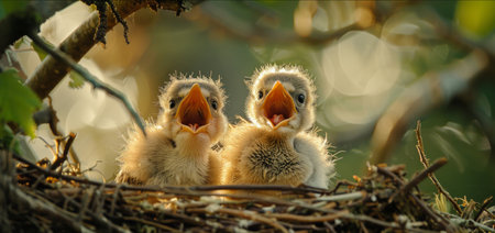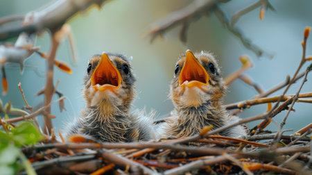Two baby birds in a nest with their beaks open, calling for food from their mother, representing nature and wildlife