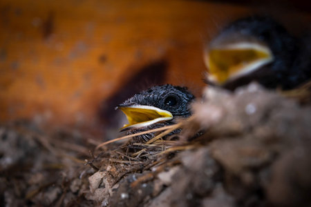 Close-up of small swallow chicks with yellow mouths in the nest against the background of the wooden paneling of the balcony. Swallow breeding next to a person.