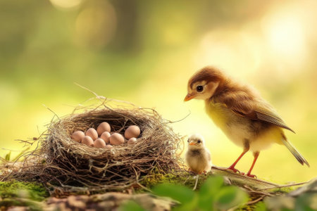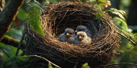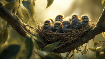 A heartwarming scene of young birds in a nest, chirping under warm sunlight surrounded by lush greenery, capturing the beauty of nature and new life.