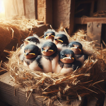 A cute image showing four fluffy baby birds with bright orange beaks sitting closely together in a well-crafted nest. Their expressions are filled with curiosity and eagerness as they look upward towards the sky or at their caregiver, invoking a sense of innocence and the natural beauty of wildlife and family bonding. AI generated image