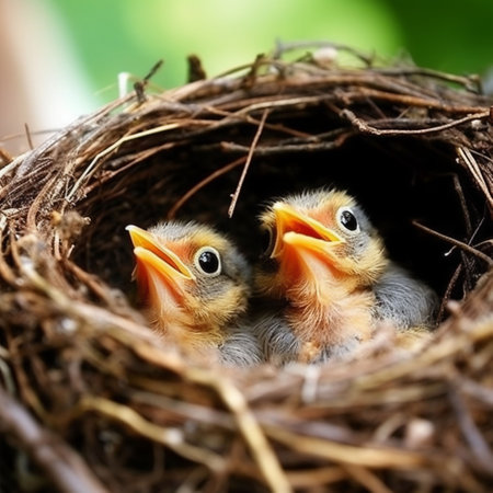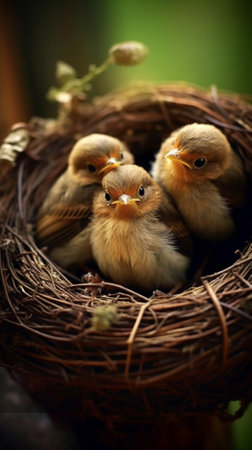 A heartwarming close-up of baby birds chirping in their nest, with soft, downy feathers and a backdrop of twigs and leaves gently swaying in the breeze