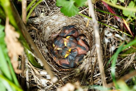 mavis songbird, Turdus philomelos nest with cute little chicks close up. In spring, songbirds build nests and hatch chicks