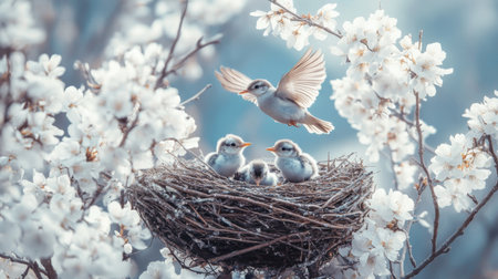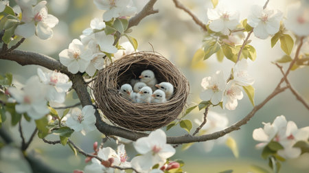 A picturesque image of a nest built into the branches of a flowering tree, with baby birds nestled inside, surrounded by blossoms, symbolizing new beginnings.