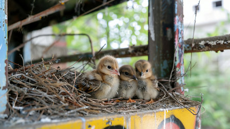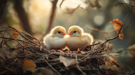A heartwarming image of fluffy chicks nestled together in a cozy nest, surrounded by soft twigs and leaves, capturing the innocence and vulnerability of young birds.