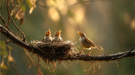 A heartwarming scene of three baby birds in a cozy nest, eagerly awaiting food from their parent. The soft focus background enhances the tender moment of nurturing in nature.