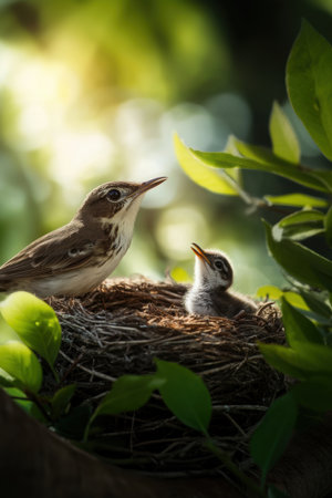 A mother bird tenderly feeds her chicks in a lush forest nest, capturing a moment of nurturing and connection in a tranquil natural setting.