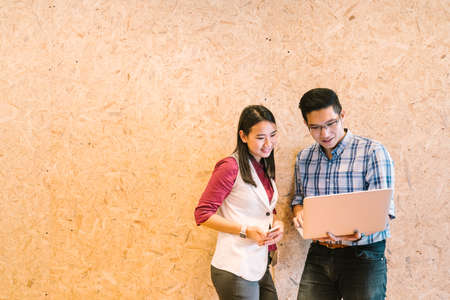 Young Asian couple or coworker working on laptop, casual business colleagues or information technology concept, with copy space
