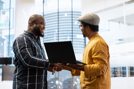 Business two men looking at laptop in the office building
