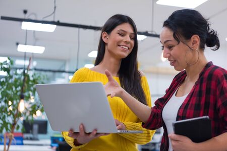 Two business women at the laptop computer discussing a creative idea for website development