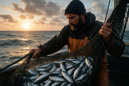 At dawn, a fisherman hauls in a heavy net filled with glistening fish while surrounded by calm ocean waters. The sunrise casts a warm glow on the scene, highlighting his focused expression.
