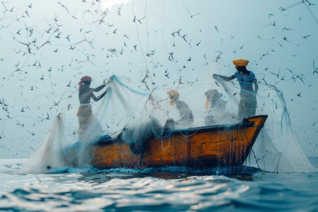 A skilled fisherman pulls a net filled with silvery fish aboard, surrounded by seagulls in flight, under an overcast sky in a coastal setting.