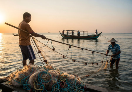 Fishermen are preparing their nets for catching fish in the sea at sunrise.
