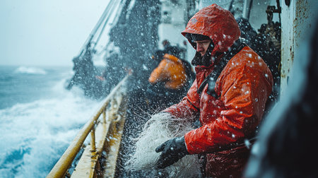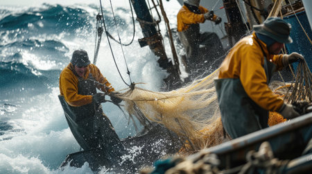 A dedicated fisherman in protective attire skillfully manages a fishing net amidst a sunlit ocean, sea spray glistening as the vessel prepares for a bountiful haul.