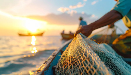 Hands of a fisherman handling a net at sunset on a fishing boat, with the golden light reflecting off the water