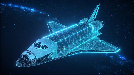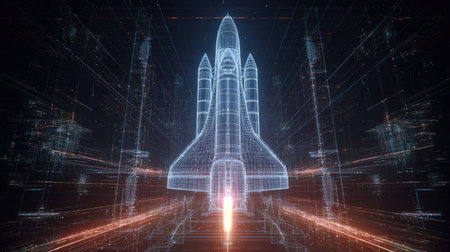 A wireframe rocket launches against a cosmic background, symbolizing technological innovation and space exploration in a digital universe.