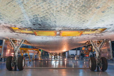 Interior of Boeing 747 Shuttle Carrier Aircraft on Independence Plaza in Johnson Space Center in city of Houston, Texas TX, USA.