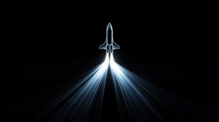 A captivating digital illustration of a futuristic rocket launching into a dark space, showcasing geometric lines and glowing particles that symbolize innovation and exploration.