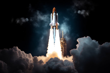 Space rocket shuttle with blast and puffs of smoke against the black sky. Spaceship lift off on black background. Space mission, concept.