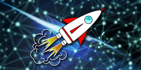 A rocket is launching in a digital space setting, surrounded by glowing blue lines and patterns against a dark background. The rocket emits bright orange flames as it ascends.