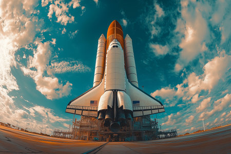 A powerful space shuttle launch, blazing into the sky amongst monumental clouds at sunset, depicting innovation and exploration