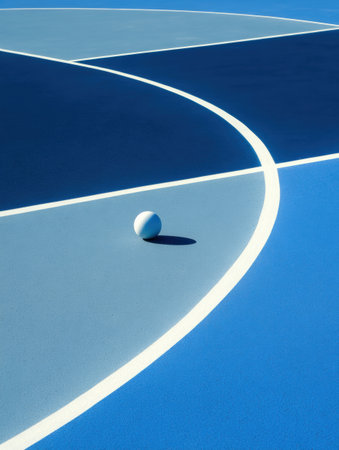 A solitary ball rests on the center court circle under bright lighting, casting clean shadows. The contrasting blue surfaces create a minimalist aesthetic.
