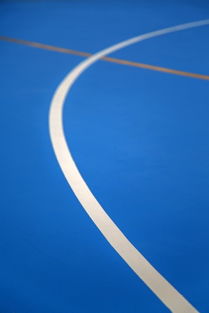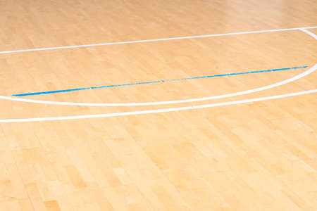Wooden floor basketball, badminton, futsal, handball, volleyball, football, soccer court. Wooden floor of sports hall with marking blue and white lines on wooden floor indoor, gym court