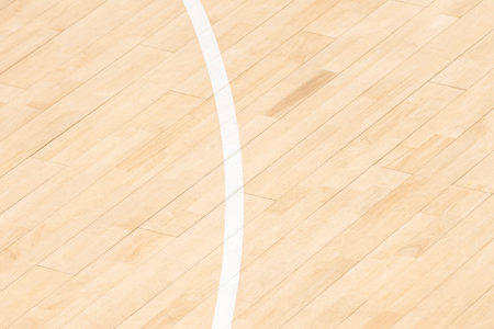 Wooden floor basketball, badminton, futsal, handball, volleyball, football, soccer court. Wooden floor of sports hall with marking lines on wooden floor indoor, gym court