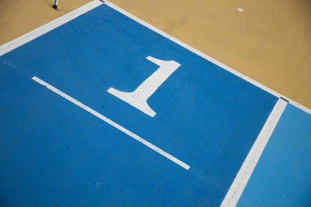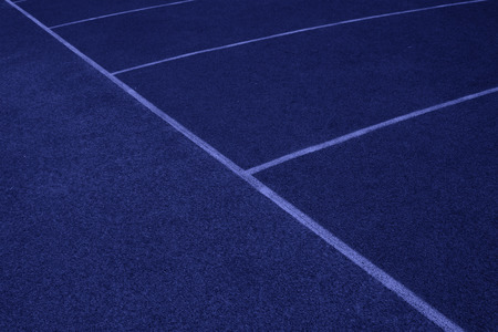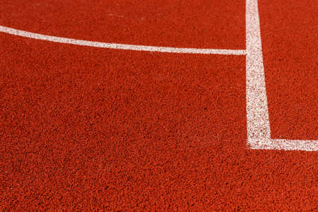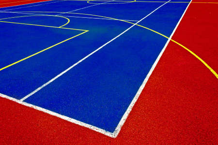 Colorful sports court background. Top view to red and blue field rubber ground with white and yellow lines outdoors