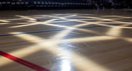 A low-angle view of a polished hardwood basketball court, with dramatic geometric patterns of light and shadow cast across the surface. The reflection on the shiny floor and the red and blue boundary lines create an artistic and atmospheric sports background.