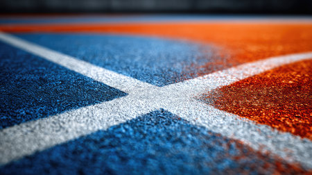 A detailed close-up of a sports court surface displaying bright blue and orange colors with unique lines and textures, ideal for athletic activities and events.