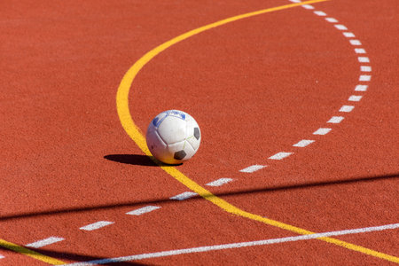A soccer ball rests on a textured outdoor court, surrounded by fading light, capturing the essence of sport and playful recreation in an inviting atmosphere.