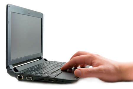 Compact laptop tablet opened exposed keys pure white background hand and fingers finger pushing on key