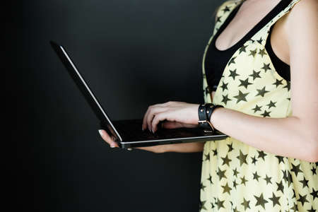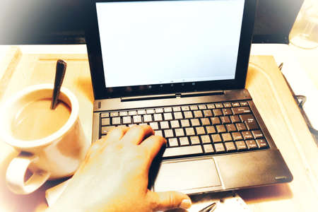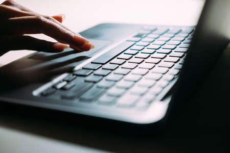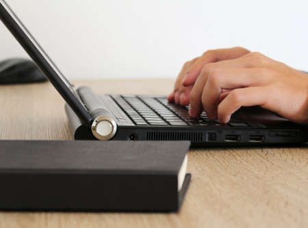 laptop computer technology. blogger or journalist or office worker typing on keyboard. work profession occupation concept