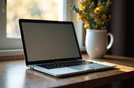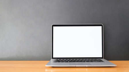 Mockup of a digital laptop with empty white blank screen on a wooden table.