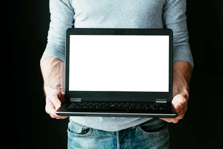 online income. work remotely and earn money from home. internet technology and modern business trends concept. man holding a laptop with empty white screen.