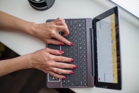 Female hands working on ultrabook on the windowsill