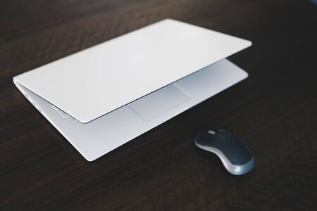 Composition of modern style white laptop with mouse on a dark wooden table