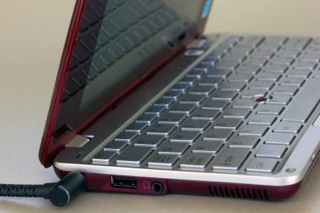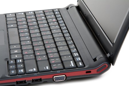 modern red small netbook with gray keyboard