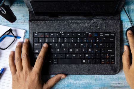 Top view of hands of an Indian man typing in keyboard of mini computer on wooden table