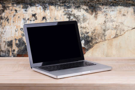 Front view of the laptop is on the work table concrete background