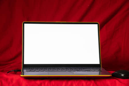 laptop with white screen on red background close up