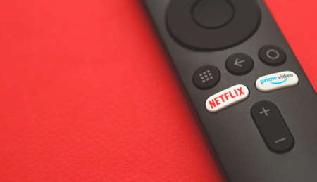 SMUTHPRAKARN / THAILAND - June 5 2021: Detail of remote control with a Netflix and google play button.There are American company specializes in and provides streaming media and video on demand online.