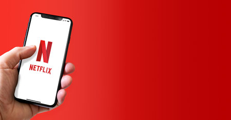 Netflix company logo, hands holding iPhone with screen of Netflix app logo.