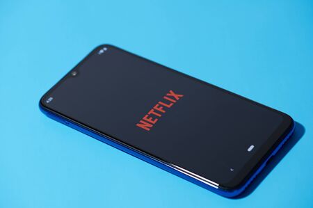 Krakow, Poland - October 07, 2020: Netflix sign on the smartphone screen. Netflix is a famous provider of Internet streaming service for watching video